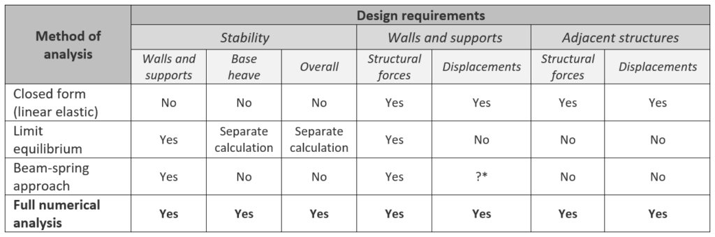 Taking the design of a retaining wall as an example, the table below, compares the capabilities of different methods of analysis. It is apparent that full numerical analysis can provide information on all design requirements. It can be used to examine situations that are not well understood, as well as go beyond the limits of normal design/construction practice. It can also be used to investigate the fundamentals of soil/structure interaction and to calibrate some of the conventional methods.