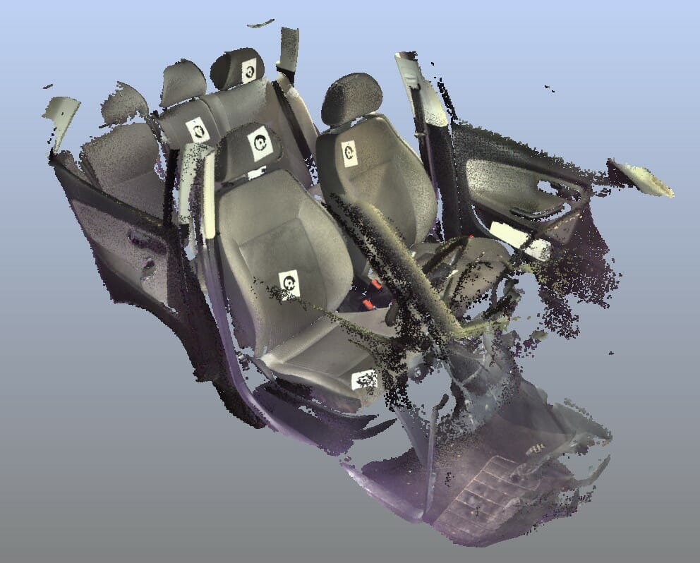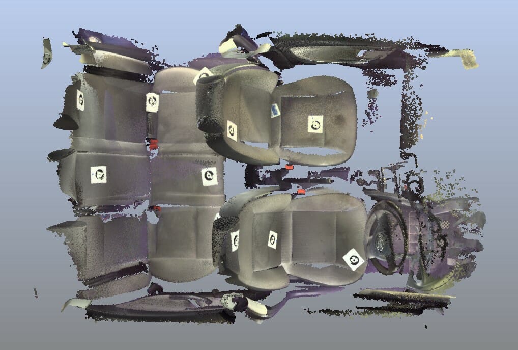 Unlike the tripod-based scanner, the handheld scanner does not project a laser beam. Instead, it works by projecting a grid pattern of infrared light. Two infrared cameras then record the shape of the grid as it distorts over the surface. The information from each scan is recorded onto a Microsoft tablet. Individual scans are then registered together to create a 3D model, which can then be navigated and analysed. The tool has a scanning range of approximately 3 metres, and it is accurate to within 1 mm at a distance of 1 metre from a surface. Figures 3 and 4 show the results of a 3D laser scan performed on the interior of an undamaged vehicle. Such images of an exemplar model of a vehicle, together with those generated from a scan of a damaged vehicle, can help interested parties to visualise the extent of the damaged caused.