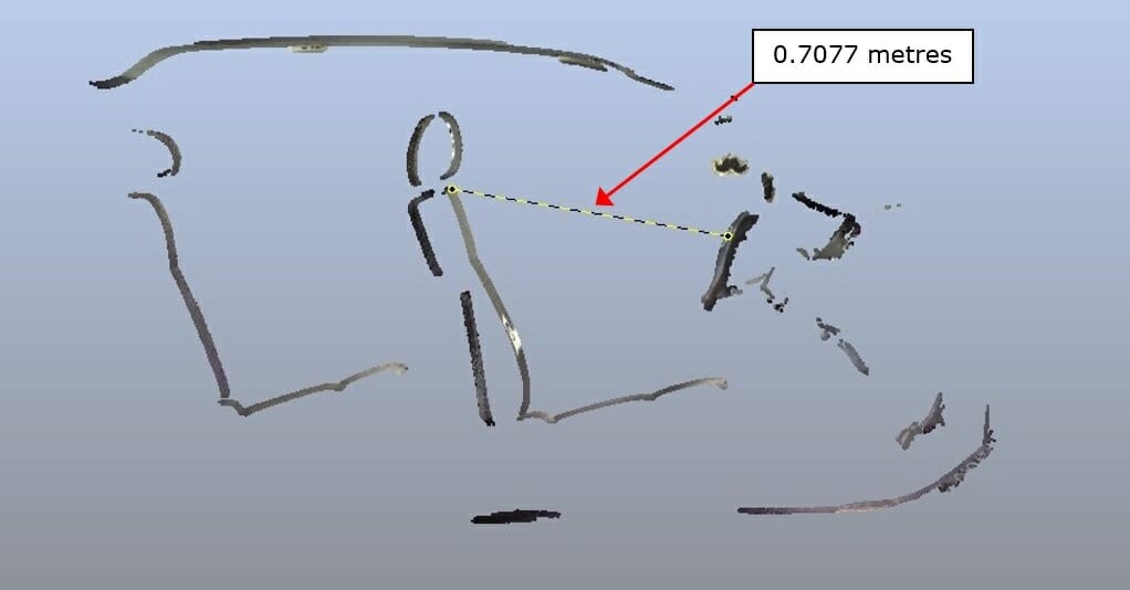 A useful feature of having a navigable 3D model is the creation of cross section views. Figure 5 shows a cross section that was taken through the offside of the passenger compartment previously shown in Figures 3 and 4. The cross section was taken in line with the centre of the driver’s seat and steering wheel. A cross section view allows exact measurements to be taken as part of an assessment of occupant contact with the vehicle in an impact. As an example, a measurement was taken on Figure 5 between the driver’s seat backrest and the steering wheel. The accuracy of measurements taken from the 3D model reduces the uncertainty when considering seat positions or proximity of occupants to crushing damage.