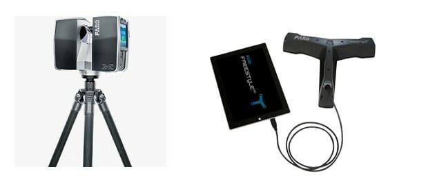 Figure 1 shows the two types of 3D laser scanner that Hawkins uses: a traditional tripod‑based 3D laser scanner (on the left), and the new handheld 3D laser scanner (on the right). The tripod-based laser scanner has been used for surveying larger areas, including scenes of collisions; the new handheld 3D laser scanner is used for surveying smaller objects. Hawkins is now using handheld scanners for creating permanent, accurate and detailed records of vehicles damaged in collisions.