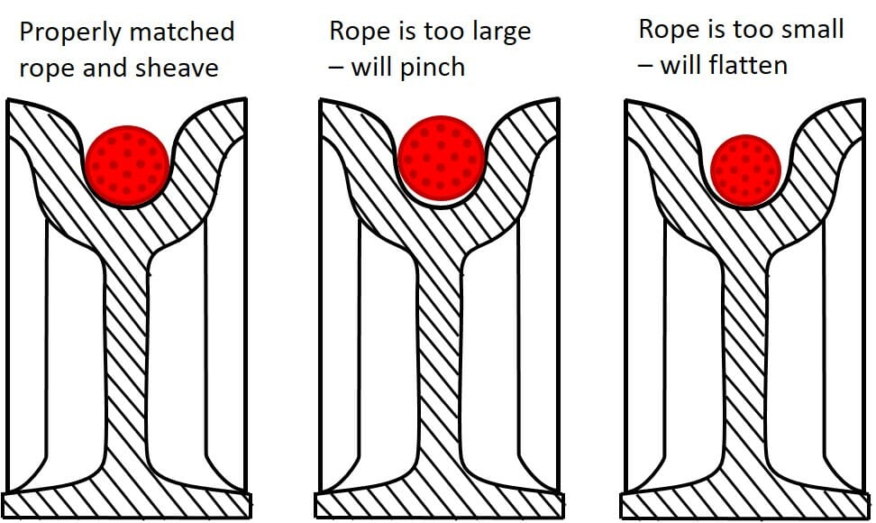 In order for the rope to work efficiently as part of a lifting or winching system, it needs to be of the appropriate minimum break strength, as well as of the correct construction and diameter. It must also have appropriate flexibility, which is expressed in terms of its minimum bend radius, to suit the diameter of the sheaves. As a rule of thumb, the greater the diameter of the rope, the greater its minimum bend radius. As such, a larger diameter rope cannot automatically be substituted for a smaller diameter rope, even though it may have a greater break strength, since its minimum bend radius may be greater than the radius of the sheaves over which it is required to operate. That will lead to over-bending of the rope, which will increase the fatigue loading on it, and reduces its service life. Similarly, if the rope diameter is not correctly matched to the sheave groove dimensions, i.e. it is too large or too small, then the load on the rope will be concentrated at certain points on its circumference, rather than being spread evenly. This will also increase the fatigue loading on the rope, resulting in increased wear and subsequently impact its service life.