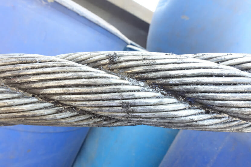 Wear and corrosion are both progressive degradation mechanisms that can be very damaging to metal wire ropes and are often the most life-limiting factors. To reduce corrosion and increase the service life of a rope, in particular when it is used in an outdoor environment, the individual wires within the rope can be protected by galvanisation (zinc coating). Furthermore, wear and corrosion can both be greatly reduced, but not eliminated entirely, by appropriate and regular lubrication of the rope. It is therefore very important that wire ropes are appropriately lubricated (with lubricants such as petrolatum, grease, petroleum-based oils or vegetable-based oils) and checked on a regular basis, particularly where they are operating in arduous conditions, such as a marine environment. This is quite challenging as the method of lubrication must ensure that the interior, as well as the exterior, of the rope is properly lubricated. Simple greasing of the surface is not adequate, and methods such as pressurised grease application need to be used. If it is not done correctly, a rope can sustain significant internal wear, caused by the rubbing together of individual wires as the rope passes over the sheaves and the drums. However, it is also important that the surface of the rope is not covered by an excessive quantity of lubricant, as this could hide and make it more difficult to spot wire breaks during maintenance inspections.