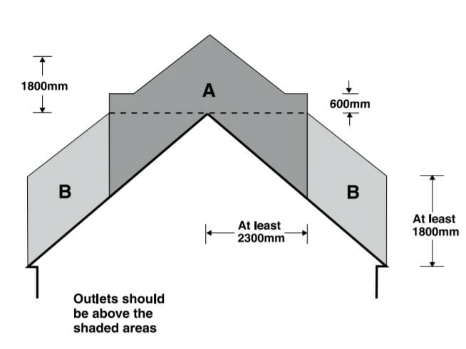 In terms of the risk associated with burning embers igniting the surface of the roof, the most important aspect of ADJ is the location of the chimney outlet. It states that the outlet should be located at least 1.8 m above the surface of the thatch and, if the outlet is situated beneath 0.6 m above the ridge of the roof, it should be located at least 2.3 m horizontally from the ridge line or the surface of the roof. Whilst compliance with ADJ does not eliminate the risk, it is clearly the case that when there is greater distance between the flue outlet and the thatch, it is less likely that an ember released from the chimney will have sufficient energy to start a fire by the time it lands on the roof.