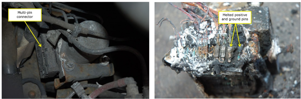 In this instance, the orientation of the multi-pin connector was such that it allowed the ingress of water. The moisture caused a tracking fault, which had bridged the live and ground pins within the ABS multi-pin connector and caused melting to occur. This vehicle was subject to a recall campaign for this issue.
