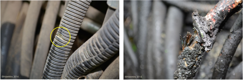 Fretting wear occurs when two contacting surfaces experience relative motion, causing localised damage. Where this becomes a concern in the manufacturing of vehicles, is the routing of wiring harnesses. If fretting wear occurs to an energised wiring harness, the insulation of the wiring becomes compromised, and this can lead to arcing damage. Arcing occurs when conductors of differing electrical potentials come into contact and create a short circuit. This in turn can lead to the ignition of the surrounding combustible materials. Below are two images of the poor routing of a supply cable that connected the battery to the starter motor in a telehandler.