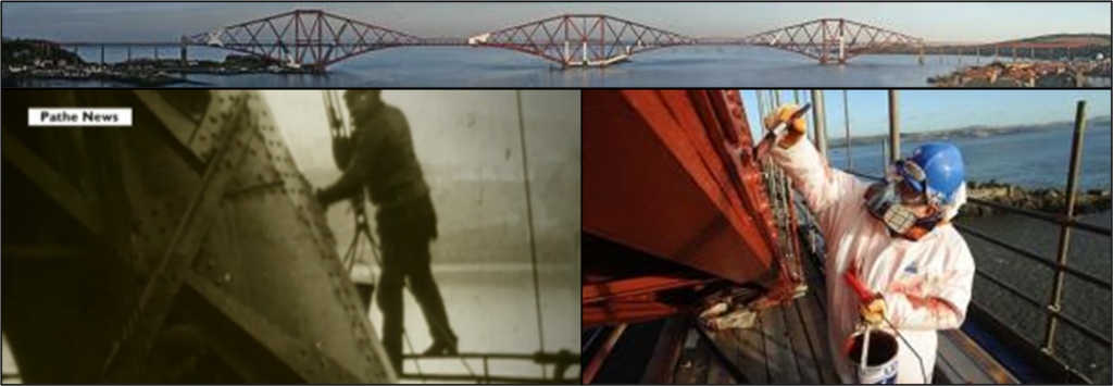 A great example of a large structure made from steel is the Forth Bridge[1] in Scotland, built between 1883 and 1890 (before the advent of corrosion resistant steels). The Forth Bridge is an example of a steel structure which, up until 2011, had to be continuously painted to protect it from the effects of corrosion.