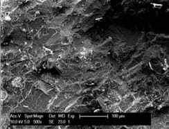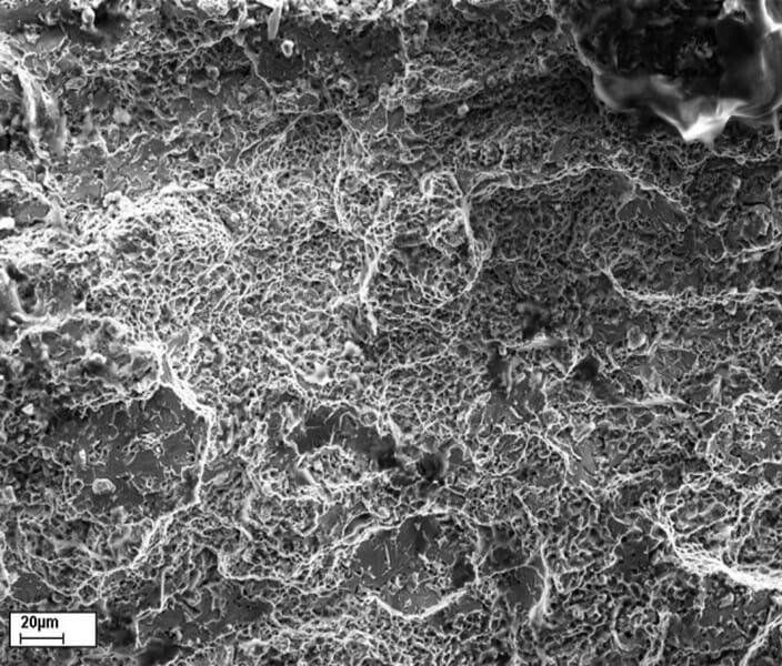 Branched cracking is a common characteristic of stress corrosion cracking. When viewed at high magnification the fracture surface of a component that has failed due to stress corrosion cracking has a faceted and granular appearance (Photograph 2 below). In contrast to this the fracture surface of a component that has failed due to a ductile overload failure typically has a dimpled appearance (Photograph 3 below). The facets and granular appearance actually reveal the small individual crystals (grains) that comprise the microstructure of the majority of engineering metals.