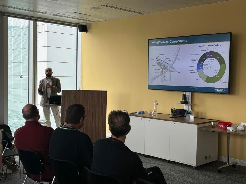Electrical Engineer Ben Lister began the presentation by discussing Widespread Issues in UK Renewable Energy. He explained that the three most common issues in the modern renewable energy industry are defective components, environmental impacts, and maintenance.