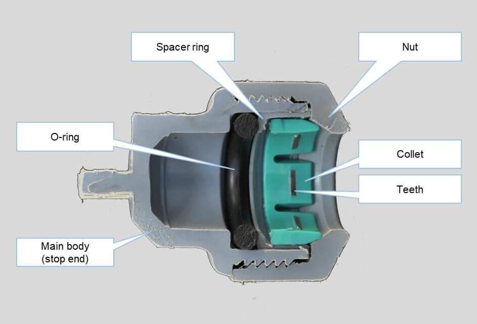 When a pipe is inserted fully into the fitting, the O-ring is pressed between the pipe’s outer diameter and the inside of the main body’s socket to create a watertight seal. The collet teeth are designed to allow the pipe to pass into the socket, but bite into the outside of the pipe and resist its extraction from the socket.