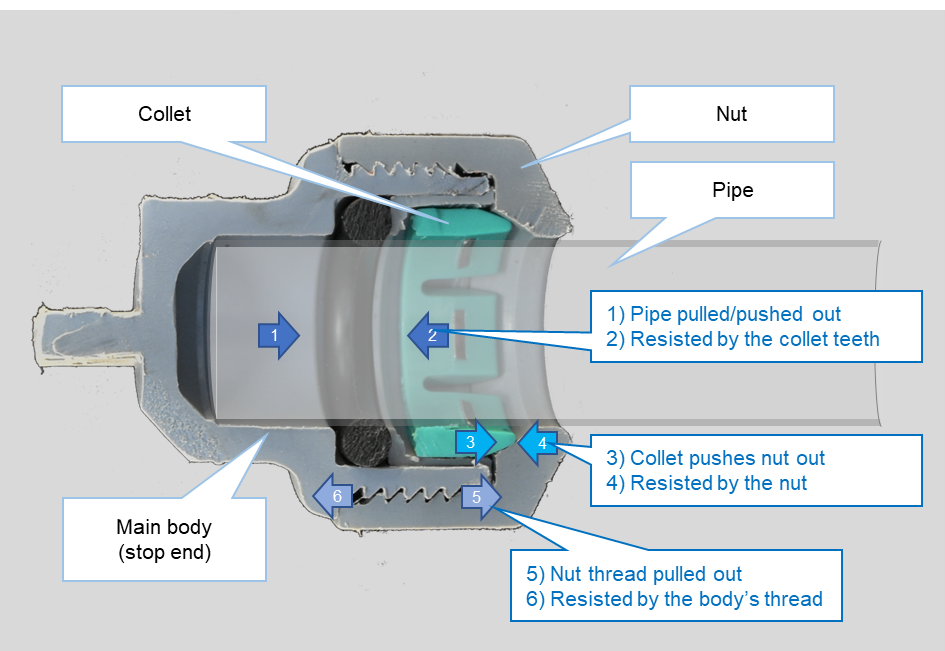 The harder the pipe is being forced out, either from internal water pressure or a pulling action on the pipe, the stronger the reaction of the nut onto the collet and the stronger the bite of the teeth into the pipe. A push-fit fitting’s ability to withstand water pressure or pull-out forces is reliant on the nut keeping the collet teeth tightly pressed onto the pipe.