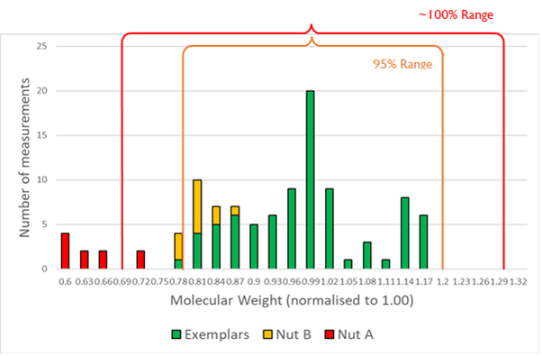 The molecular weight of exhibit and exemplar nuts was assessed. Multiple measurements were recorded on each nut to reduce the contribution of measurement errors. The fitting involved in this connection was a straight coupler with two end nuts. The molecular weight of each end nut was assessed on all specimens. The exemplars’ measurement data were grouped but the exhibits’ data for the two end nuts, labelled Nut A and Nut B, were analysed separately. The data were therefore split into three groups; values for (1) the exemplars, (2) Nut A, and (3) Nut B. The normal distribution was used to predict the ranges where 95% and 99.7% (~100%) of the molecular weight values were expected to lie for this type of fitting.