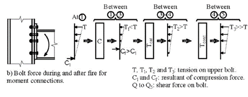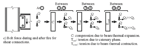 The forces that develop in bolts during a fire depend on the type of connection and the fire phase (heating or cooling). Figure 3 illustrates the typical forces on bolts during the heating and cooling phases for moment and shear beam-to-column connections. For moment connections, the tensile force in the bolts tends to reduce with increasing temperature due to the incoming beam undergoing expansion and exerting an opposing compressive force on the connection. For shear connections on the other hand, the force on the bolts tends to increase with the temperature, providing that the gap between the beam and the column flange is larger than the beam elongation during fire. Thus, the bolts in connections designed to carry only shear are more vulnerable to failure during the heating phase and before developing catenary action. In some scenarios, other factors such as the elongation of the bolt holes within the beam web and an increase of the bolt ductility with temperature may improve the connection shear behaviour.