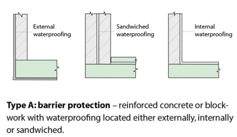 - Type A - protection is provided by a barrier system applied to the structure, either internally, externally or sandwiched between wall skins. Examples include: bonded sheet membranes, liquid applied membranes and cementitious renders.