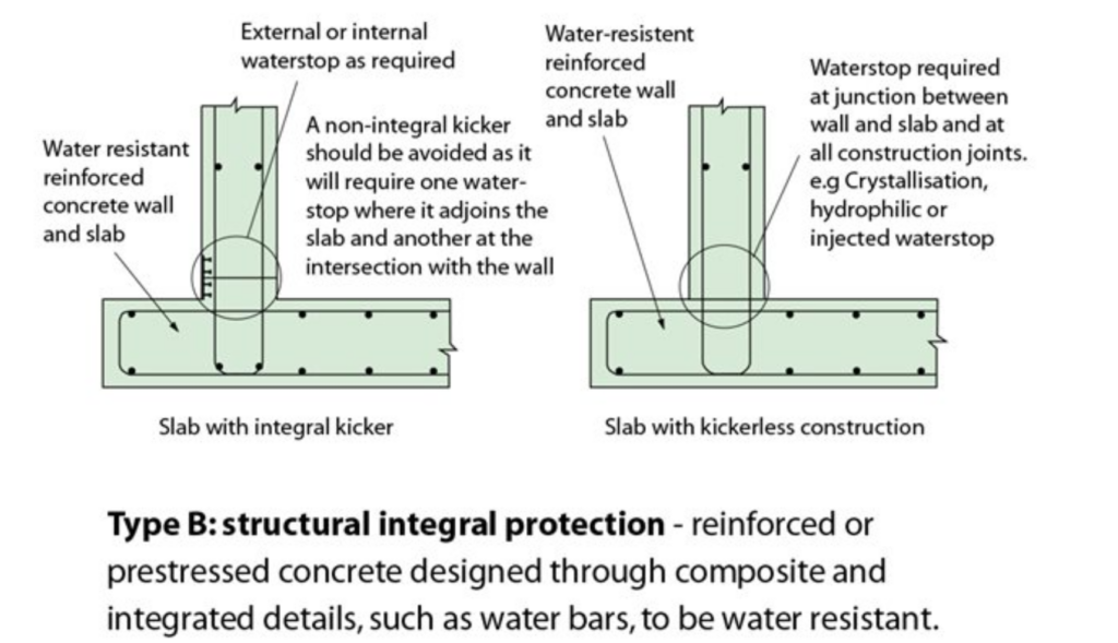 - Type B - protection is provided integrally by the structure itself, such as where waterproofing admixture is added to the structural concrete.