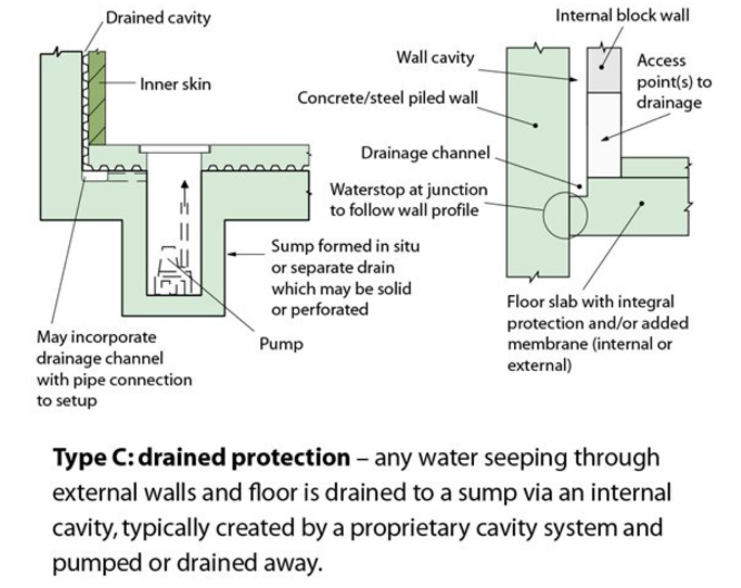 - Type C - protection is provided by the incorporation of an appropriate internal water management system, such as a cavity drain with a perimeter channel leading to a sump with pumps. This is commonly a dimpled (egg shell) sheet placed against the internal face of a structure, designed to intercept water penetrating the structure and direct it into a drainage system.