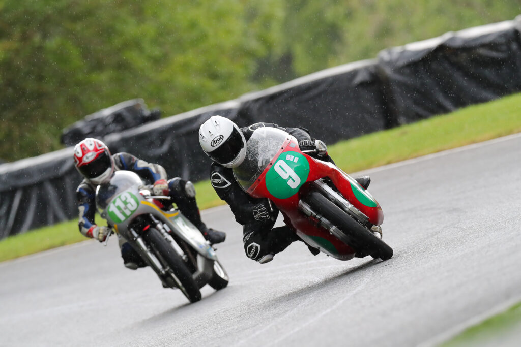 On what was unanimously agreed to be a very slippery track, Charles managed 3rd in the Classic 350 cc class aboard the Honda CB350 K4 prepared by T.T. Engineering, and 2nd in the Classic 250 cc class. Sunday provided mostly dry weather all day and in the morning races Charles was not able to do any better than 3rd in the 250 cc class, albeit, the race was stopped on lap 3 of 7 due to an accident. A race-long battle between Charles and Andy Guy in the 350 cc class ended when they hauled in Steve Mason and Guy lost control of his Aermacchi on the flat-out entry to Charlies 1 corner. Although Charles then passed Mason to take 3rd in class, the race was stopped and the count-back resulted in Charles being classified 4th in class on the results sheet. The initial dry start to the final 250 cc race ended in rain. It is always hard to judge just how wet the circuit gets as it starts to rain, and Charles initially decided not to back off in an attempt to catch and pass class leader, Iain Green. Green, however, rode a brilliantly defensive line to inhibit any possibility of Charles being able to sneak pass for a class win. Nevertheless, 2nd in class was sufficient for Charles to maintain a lead of 41 points at the top of the Classic 250 cc tables. By the time the 350 cc class was called, the circuit was fully dry and although Charles was not able to do any better than 4th in class, that was sufficient to move him back into 3rd in the Classic 350 cc championship.