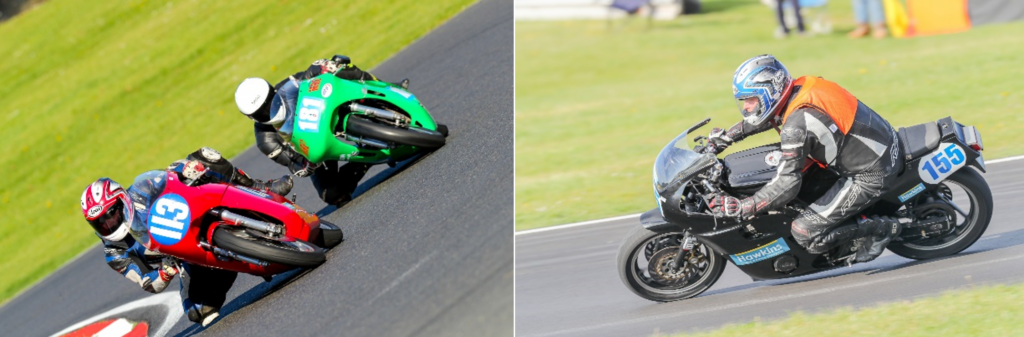 On Sunday morning Charles repeatedly traded places with #50 Louie Allfrey (Ducati 250) in the first race of the day, only for backmarkers on the final lap to slow progress through Paddock Hill, allowing Louie to slip past and take the victory by just under a second. With one of the club’s top riders, #70 Harley Rushton, inexplicably managing to fall off during the sighting lap for the 350 cc race, Charles was able to do one better in Sunday’s first 350 cc race and finished second in class. With the electrical gremlins banished, James’ progress continued and he was able to further reduce his lap time by a second a lap. Racing within the Production class is very close, but with competitive lap times, James was now more than capable of lapping within the ‘main pack’ and well ahead of the other novice riders.