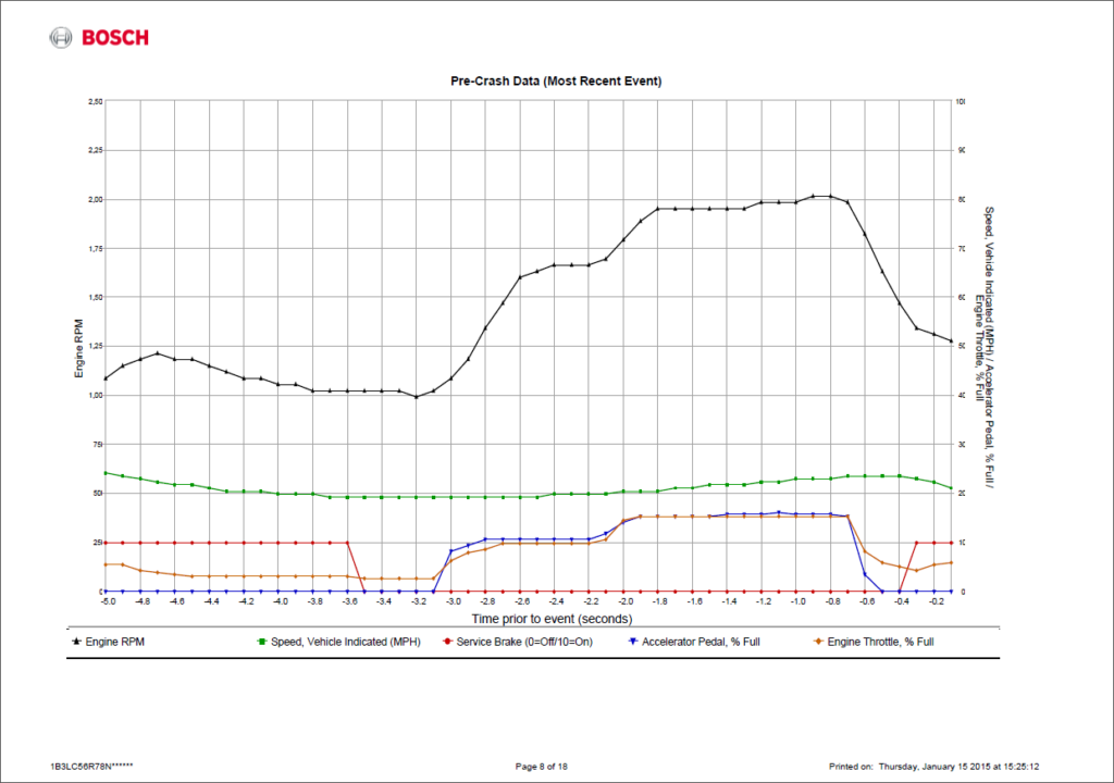 Typical data available from the five seconds before impact include, longitudinal and lateral maximum changes in velocity, longitudinal and lateral accelerations, vehicle speed, engine RPM, application of the throttle, application of the brake, steering inputs and data on occupants including which seats were occupied, the seat positions and which seatbelts were in use.